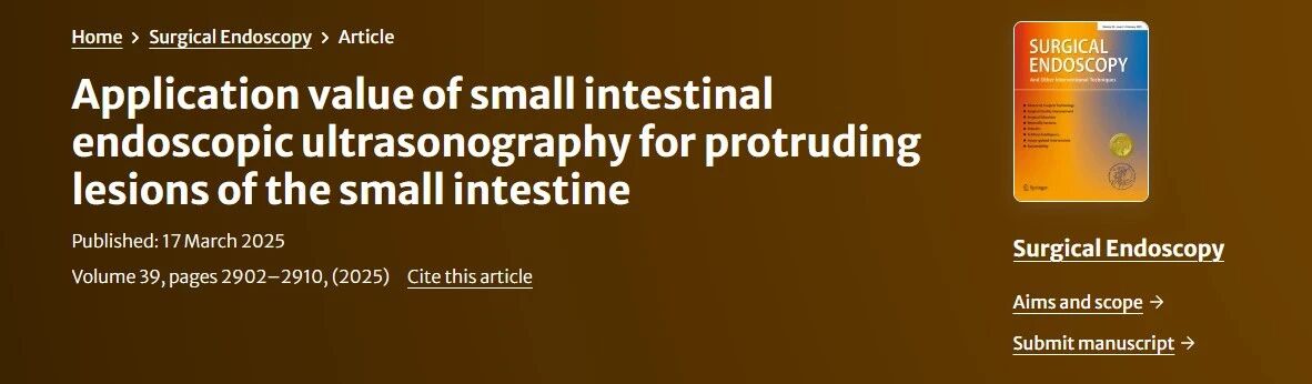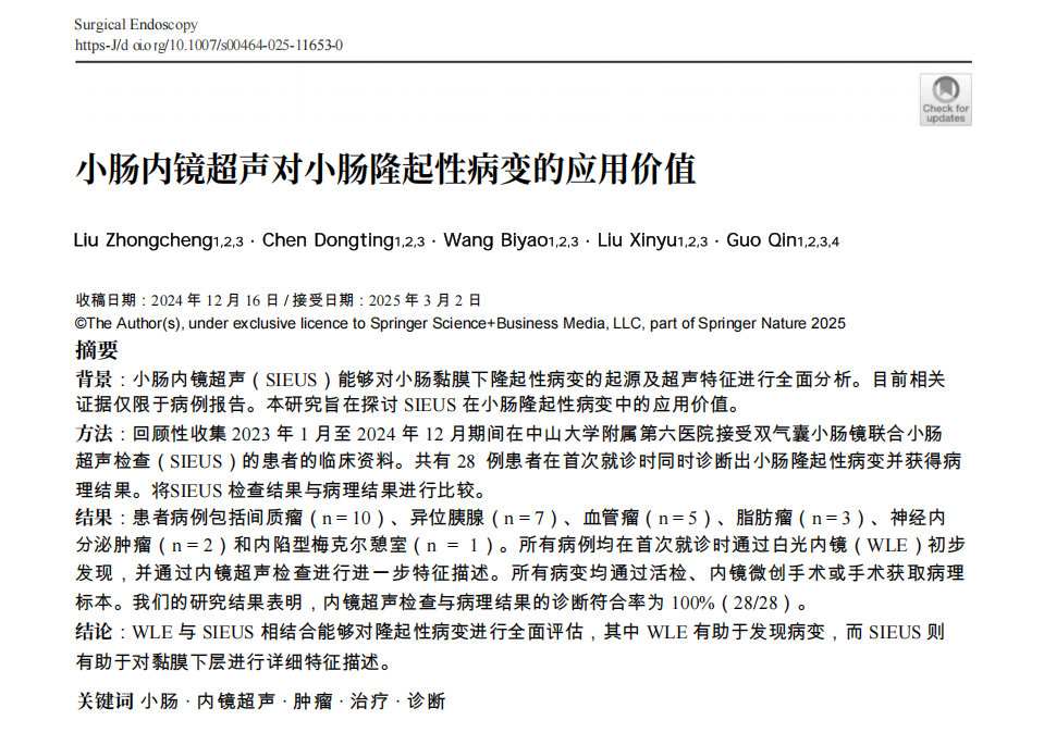 近日,中山大学附属第六医院小肠内镜科郭勤主任及其团队在Surgical Endoscopy 国际期刊上发表了“小肠内镜超声对小肠隆起性病变的应用价值”的学术研究报告。