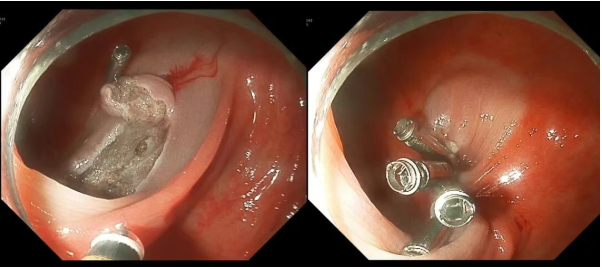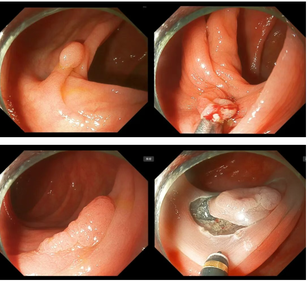 退镜观察,肝曲可见一大小约1.0cm*0.8cm带蒂息肉,予以圈套后行电凝电切,术后创面封闭钛夹1枚止血,术后标本送检,距肛门约60cm可见一大小约1.2cm*0.2cm扁平隆起,表面略凹陷,于其周边行粘膜下注射后中央钛夹欠佳,以黄金刀行周边粘膜预切开,后逐层剥离病变,术中剥离较困难,以钛夹1枚行内牵引后继续剥离病变,术后可见穿孔,以钛夹8枚封闭创面,观察未见活动性出血,术后标本送检,另患者远端结直肠可见大小约0.6cm-0.4cm息肉共4枚,均予以圈套切除。